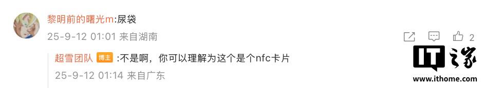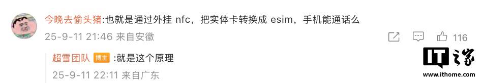 对此,评论区有用户称“也就是通过外挂 NFC,把实体卡转换成 eSIM,手机能通话么”,对此,超雪回应“就是这个原理、从 NFC 中取电”,同时表示相应功能不影响手机 NFC 功能。
