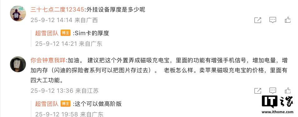 在形态方面,超雪团队透露相应产品将采用 NFC 贴纸方式,厚度为“SIM 卡的厚度”,同时还有望推出“磁吸移动电源”形态高阶产品。