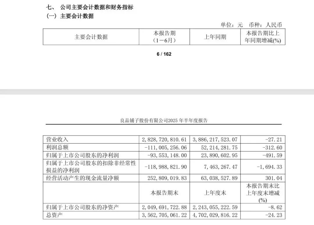 日前,良品铺子递交了上半年成绩单。财报显示,上半年良品铺子实现营收28.29亿元,同比下降27.21%;归母净利润为-9355.31万元,同比下滑491.59%;扣非归母净利润为-1.19亿元,同比下滑1694.33%;利润总额为-1.11亿元,同比下滑312.6%。