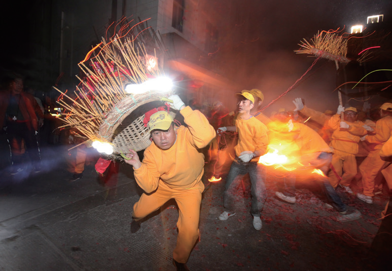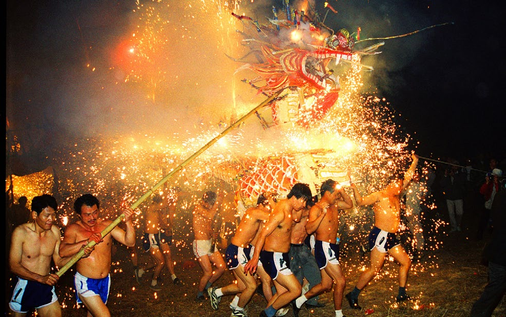 按传统习俗,每年农历十二月就开始制作龙灯,即用竹篾作龙的躯体,丝棉纸糊成龙身,再绘上鳞甲、云朵、太极图等,制作成气势雄伟、栩栩如生的蛟龙形象。正月初八,人们开始在龙身上安插各式烟花,对龙灯进行“武装”。正月初十夜晚,随着锣鼓响起,舞龙健儿上身赤膊、下穿短裤、头戴竹笠,托举着浑身冒火的彩龙豪迈出场。表演时,掌珠人在前面引导龙首前行,龙身、龙头、龙尾火花四溅,火龙狂奔欢呼、跳跃腾挪。